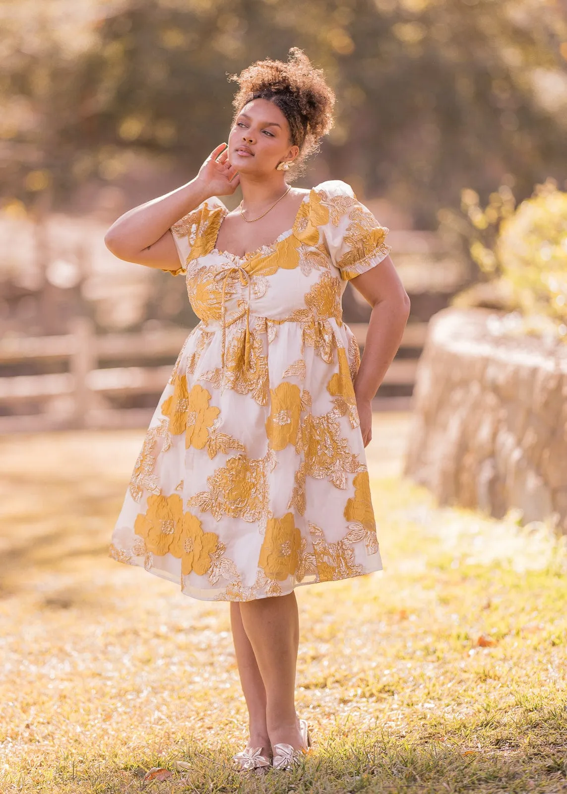 Add a touch of romance to your day with the Beaumont. This mini babydoll dress features kisses of shimmering gold accents, with a ruched bow detail and hidden back zipper. The textured fabric is perfect for all body types, while the elastic puff sleeves add a sweet finishing touch.