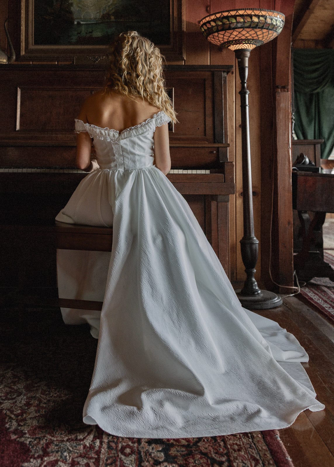 An elegant maxi dress with a full skirt, lace-trimmed basque waist, and textured jacquard fabric. Elastic straps can be worn on or off the shoulder, offering versatile styling with a structured, supportive bodice.