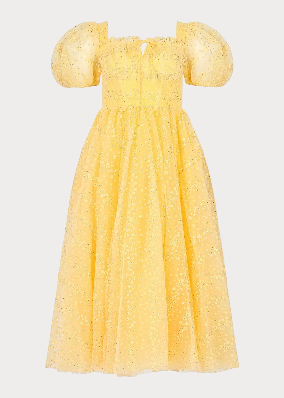 Everbloom Puff Sleeve Midi Dress in Yellow