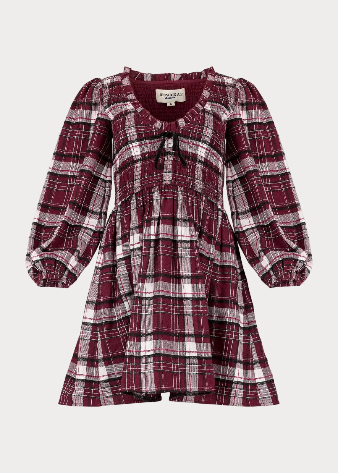 The Hailey Dress is cozy holiday charm in plaid. Designed with a smocked bodice, billowy long sleeves, and a velvet bow tie at the neckline, it blends comfort with festive style. The deep red and black checks make it a perfect choice for holiday gatherings, casual celebrations, or cozy nights by the fire. A playful yet elegant piece that feels merry all season long. Add another festive plaid to your holiday wardrobe with our Pyper Dress.
