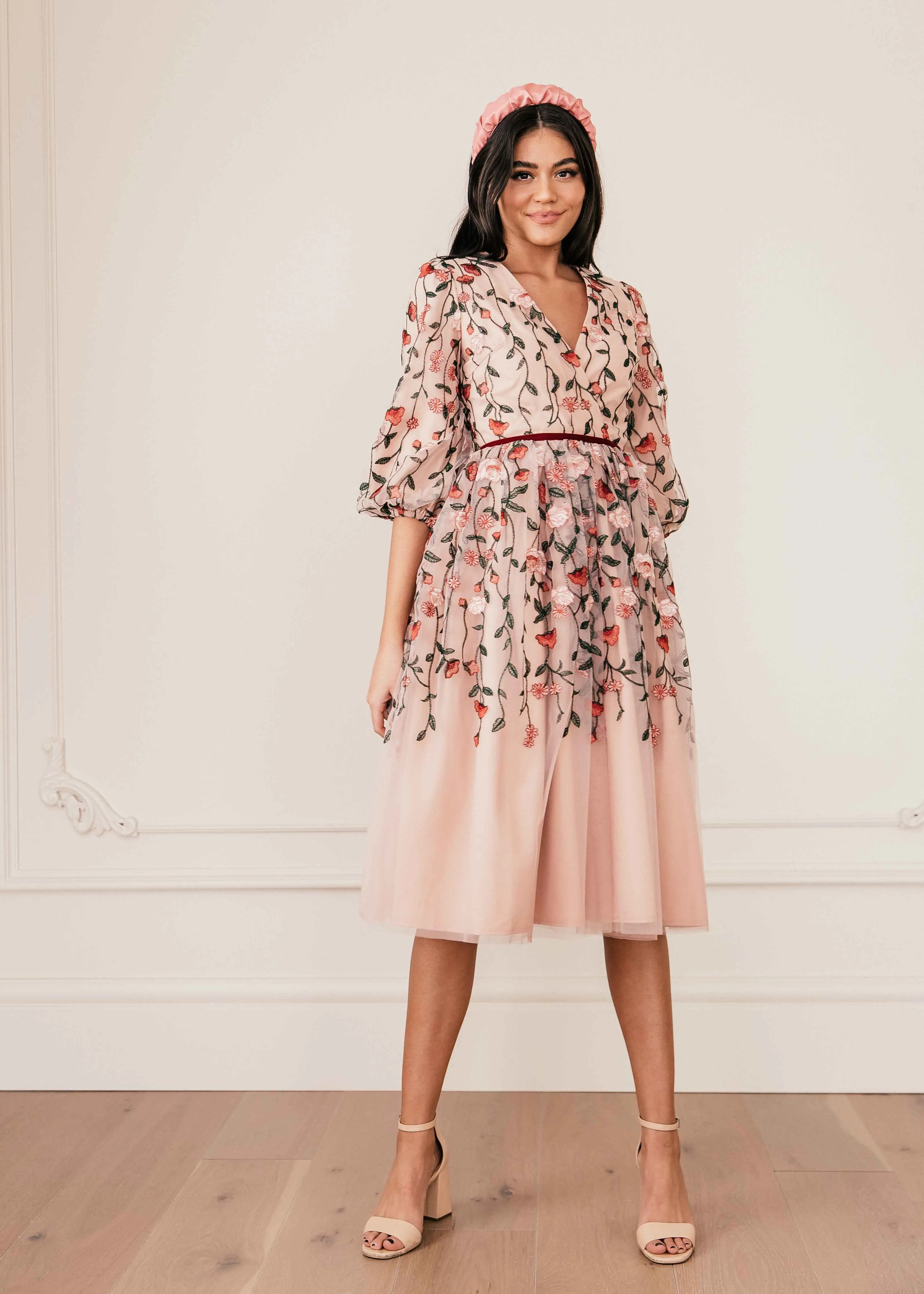 A romantic black midi dress with allover dimensional floral appliqués. Designed with a faux wrap V-neckline, elastic quarter-length sleeves, and a removable velvet waist tie for a softly defined silhouette.