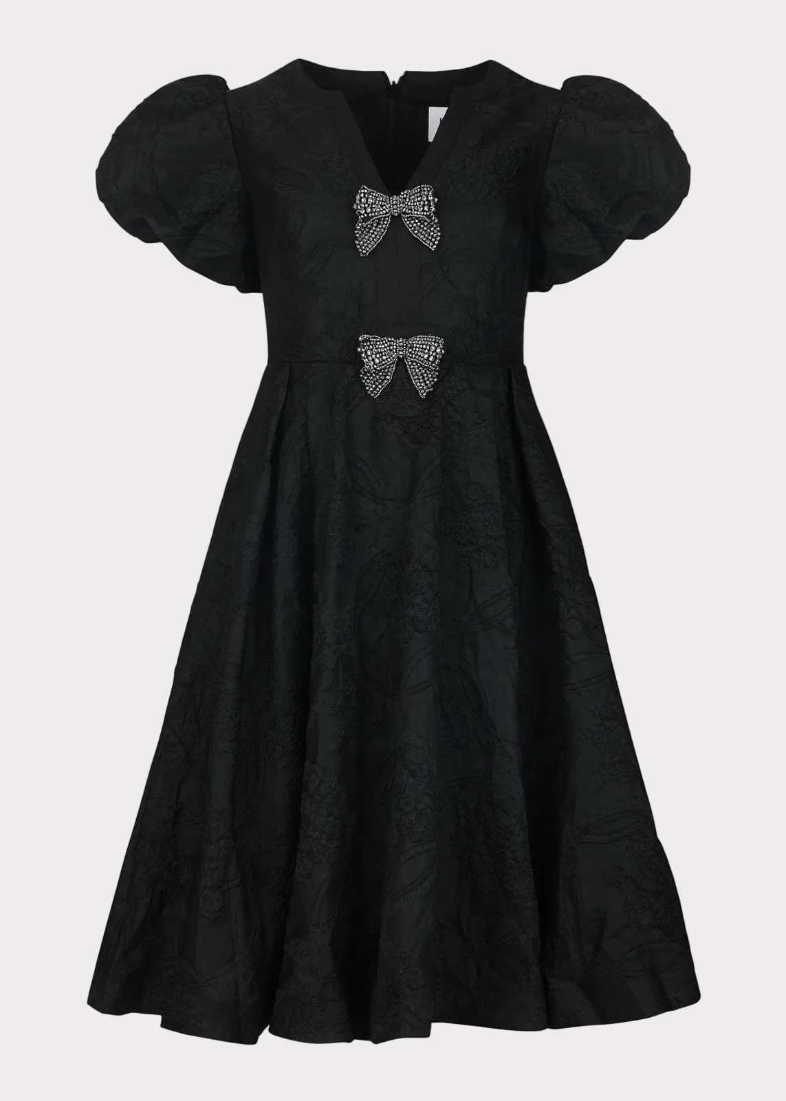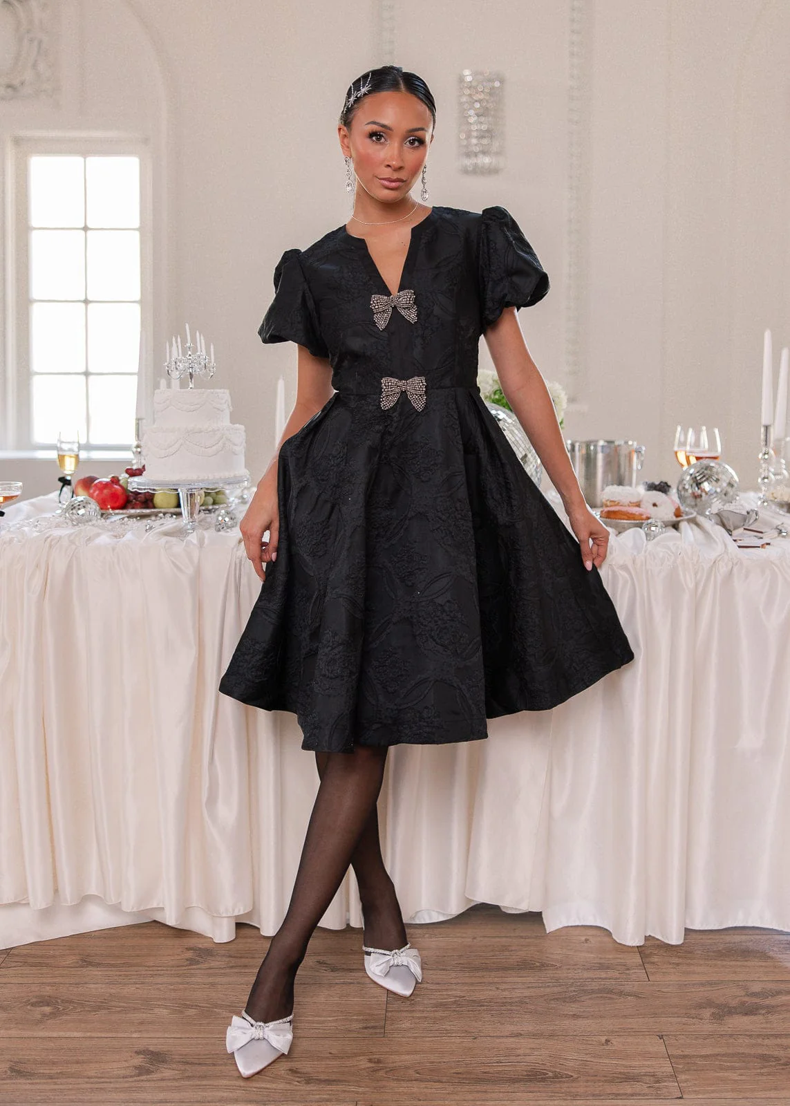 Timeless elegance meets modern glamour in the Lennon Dress. Crafted from luxurious black jacquard fabric, this midi dress features voluminous puff sleeves and two crystal-embellished bow accents that add a touch of sparkle. Perfect for holiday parties, black-tie events, and New Yearās Eve celebrations, the Lennon Dress captures sophistication with a playful twist. Pair it with heels and statement jewelry for an effortlessly chic little black dress moment. Shop another LBD option HERE.Ā
