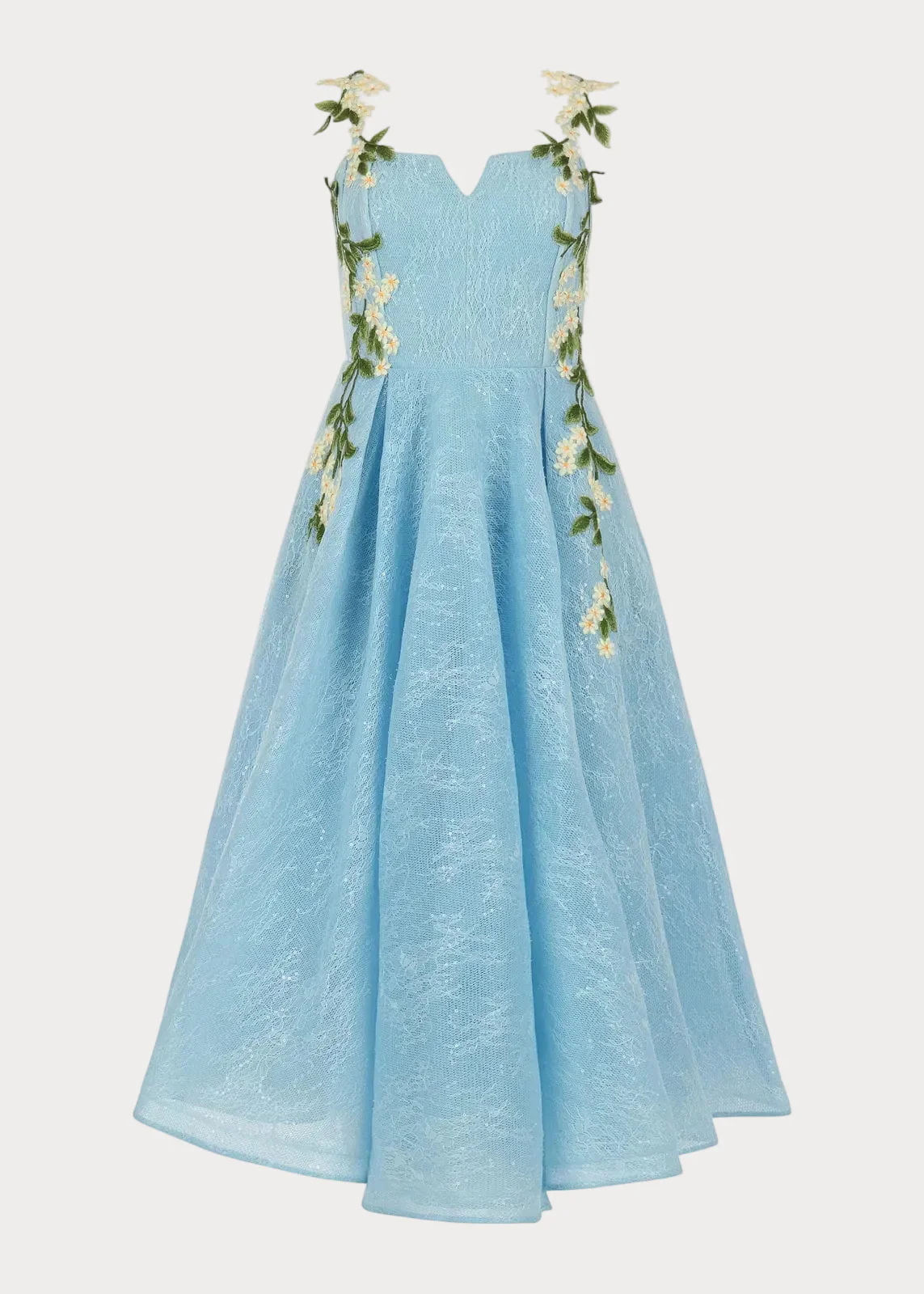 Drift into a dream in our Lily Petal Dress, a breathtaking gown designed for dreamy moments. This sky-blue beauty features delicate lace detailing and cascading floral appliqués along the straps and bodice, evoking the elegance of a blooming garden. The full, sweeping skirt adds a touch of regal charm, making it perfect for special occasions.