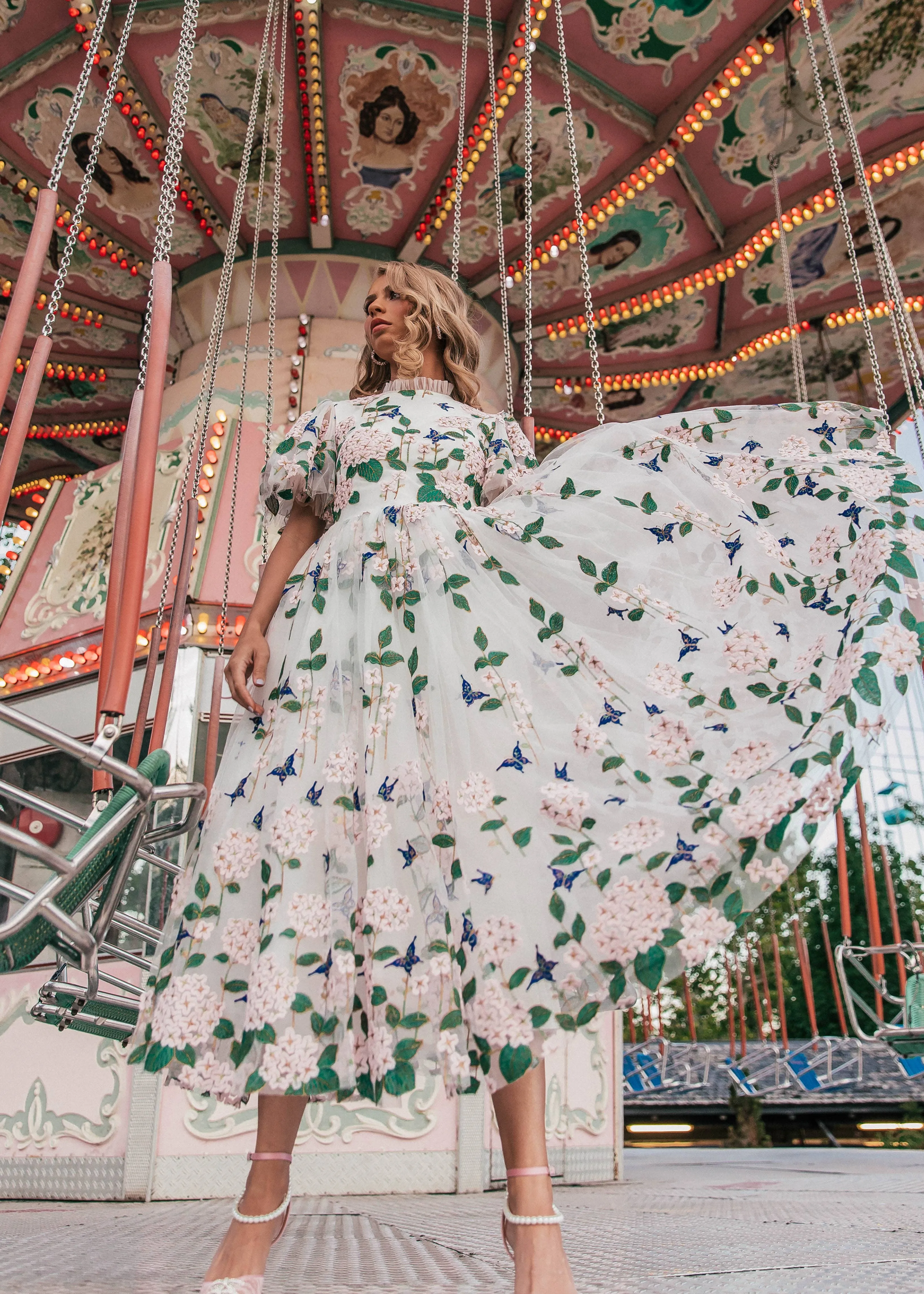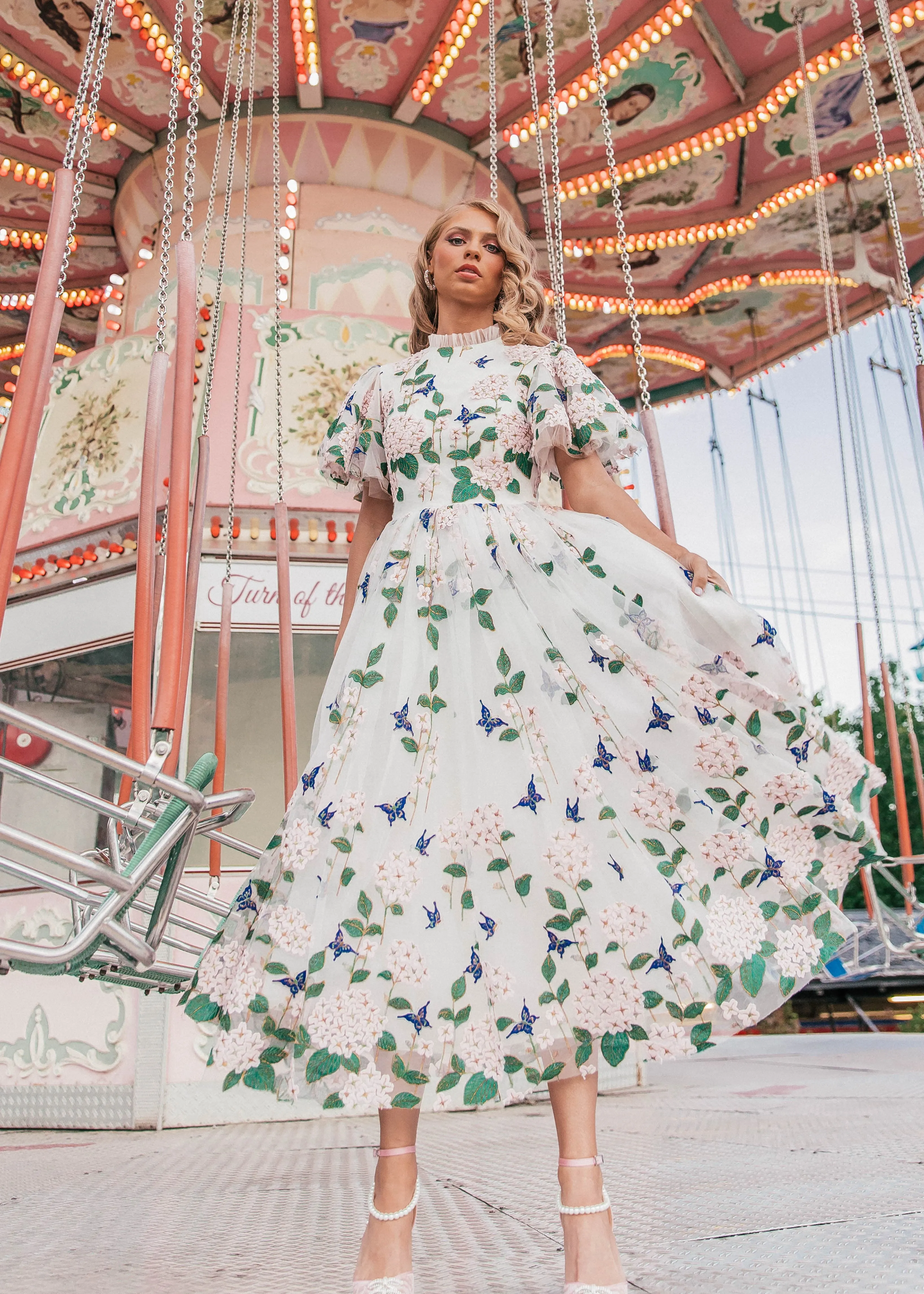 Designed with allover delicate floral embroidery. Sheer flutter sleeves and a fitted waist create a softly feminine silhouette, finished with ruffle detailing along the neckline and a hidden back zipper for easy wear.