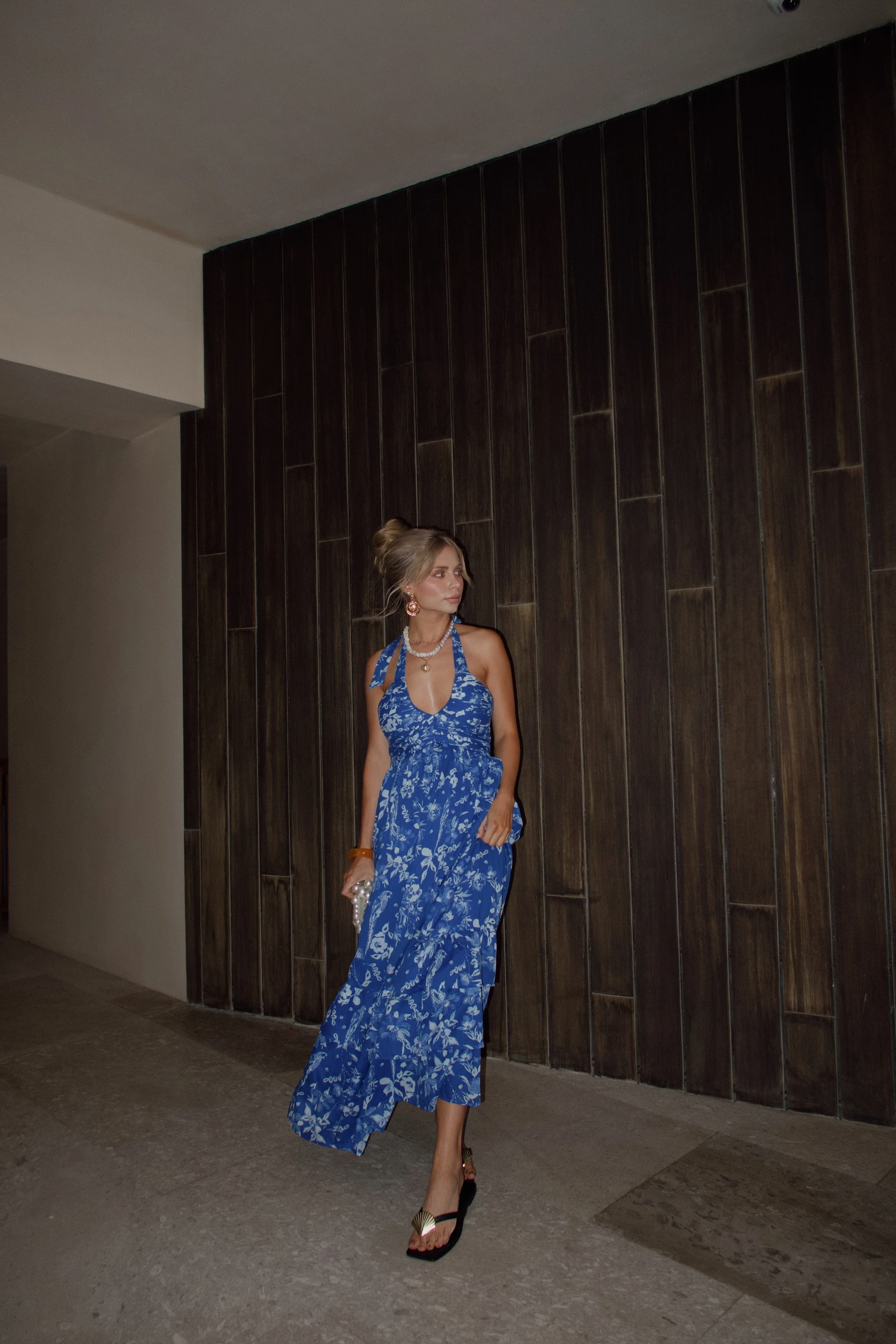 The Merliah Dress captures the essence of effortless beauty with its bold blue and white floral design. The halter neckline and ruched bodice create a flattering silhouette, while the tiered maxi skirt adds graceful movement. Perfect for tropical getaways, summer soirées, or a dreamy date night, this dress is as versatile as it is stunning. Just add your favorite sandals and a sun-kissed glow for the ultimate chic look!