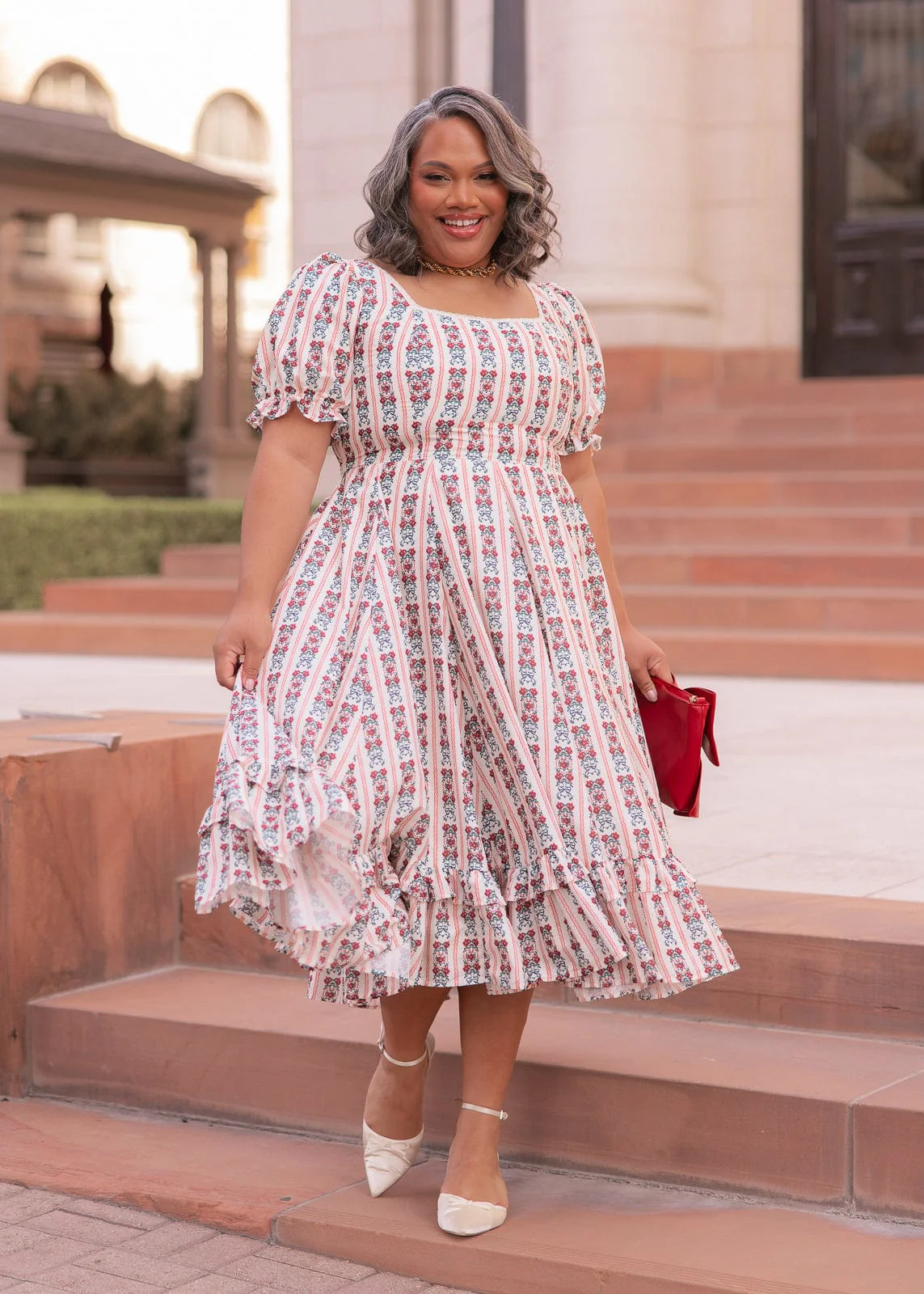 The Rue Dress is a vintage-inspired holiday beauty, patterned with festive stripes and delicate floral motifs. With puff sleeves, a square neckline, and a ruffled hem, it brings a charming touch of nostalgia to the season. Its flattering fit and flowing skirt make it perfect for twirling at holiday gatherings or cozy family celebrations. A timeless dress that feels both cheerful and elegant. Match your mini HERE.