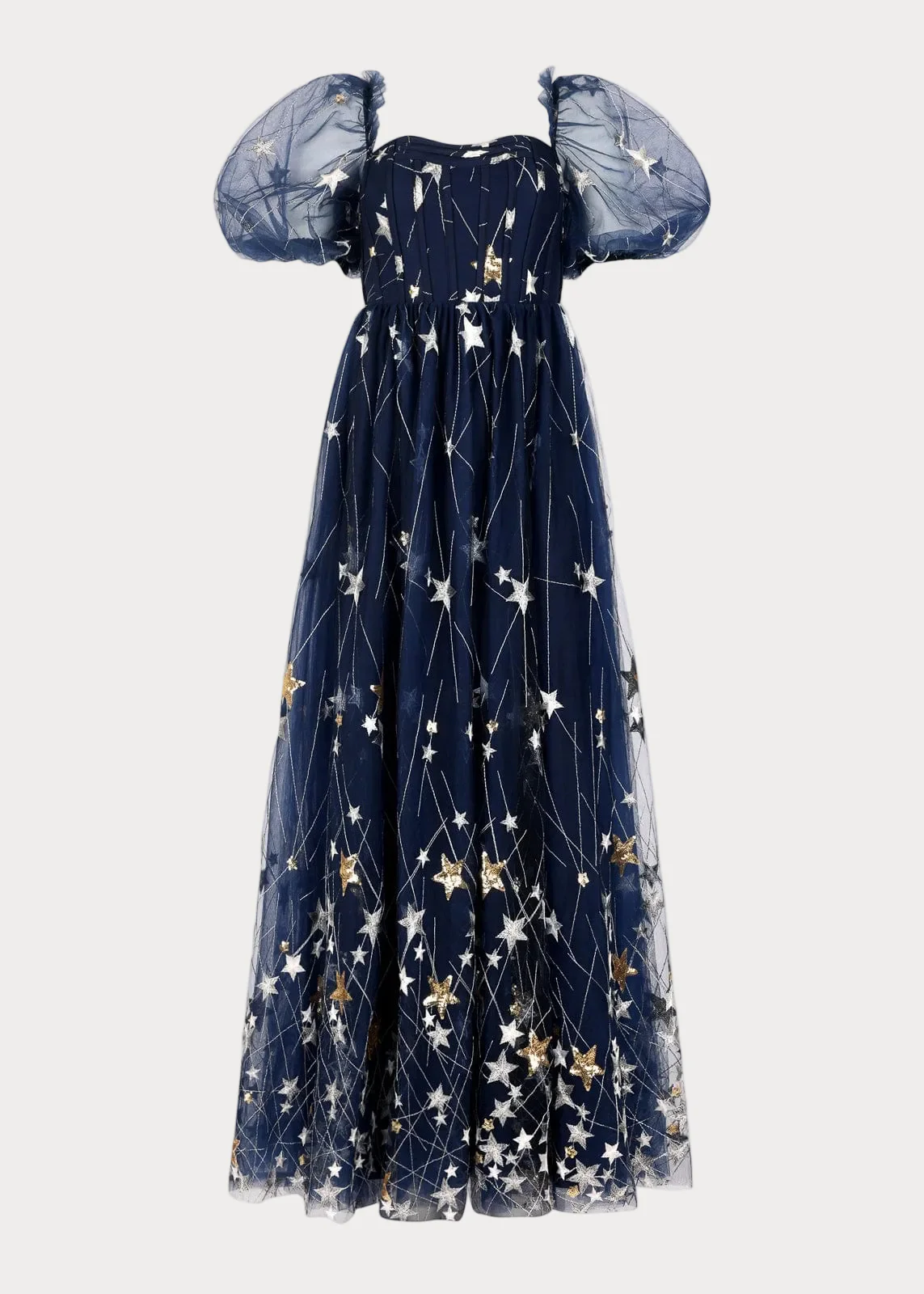 Shine like the night sky in the Starla Dress, a stunning navy gown adorned with shimmering silver and gold star embroidery. Featuring dreamy puff sleeves and a flowing tulle skirt, this celestial-inspired dress is perfect for holiday parties, New Year’s Eve celebrations, and special occasions. Designed to make every twirl sparkle, the Starla Dress brings magic and elegance to your festive wardrobe. Pair it with gold heels or a statement clutch for an unforgettable holiday look. Add another celestial look to your wardrobe with the Stella Dress.
