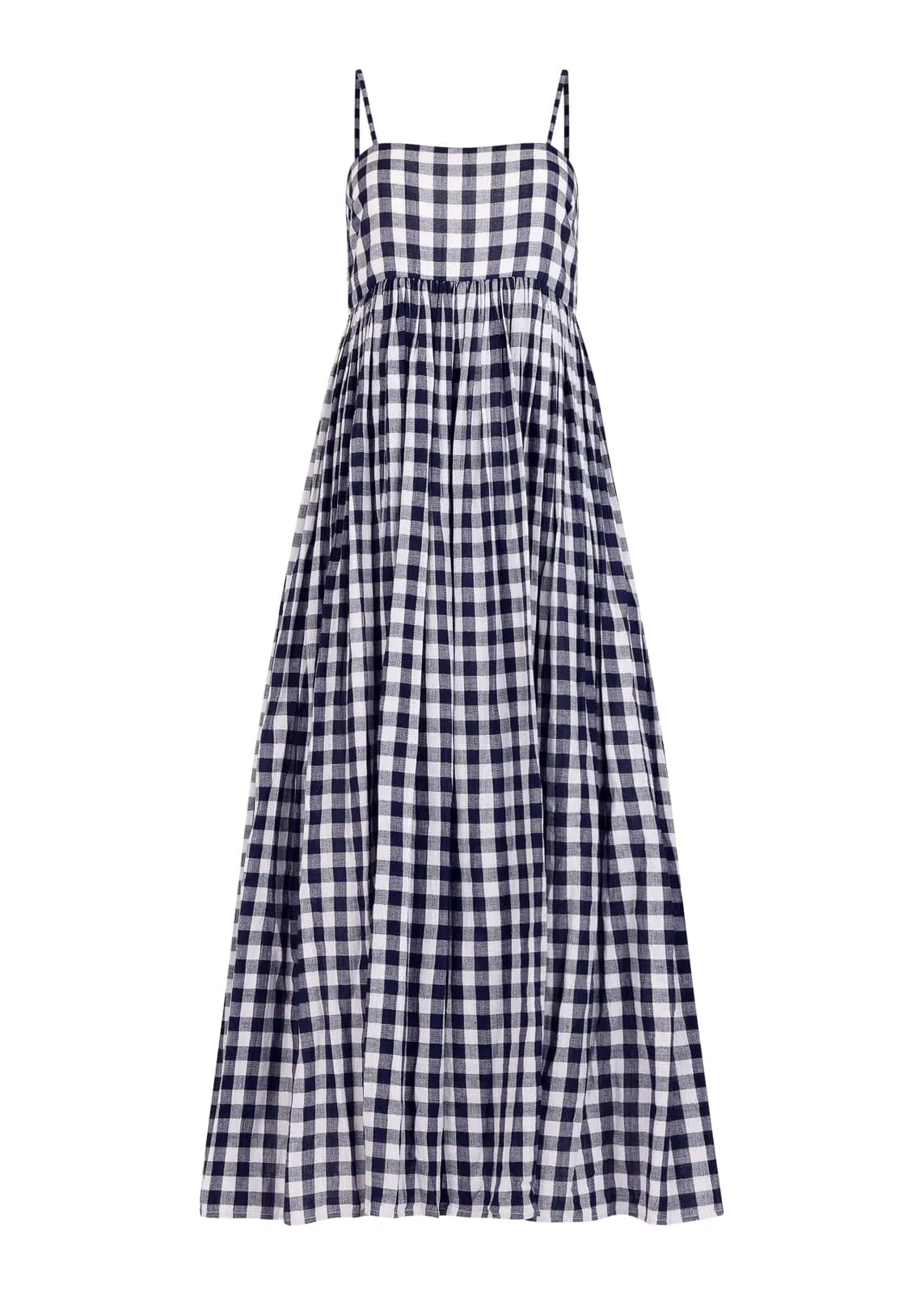 Effortless and timeless, the Tessa Dress features a classic navy gingham print with a breezy silhouette perfect for sunny strolls and weekend picnics. Its adjustable spaghetti straps and flowy fit offer all-day comfort with a touch of vintage charm. Pair it with sandals or sneakers for that laid-back, coastal cool look.