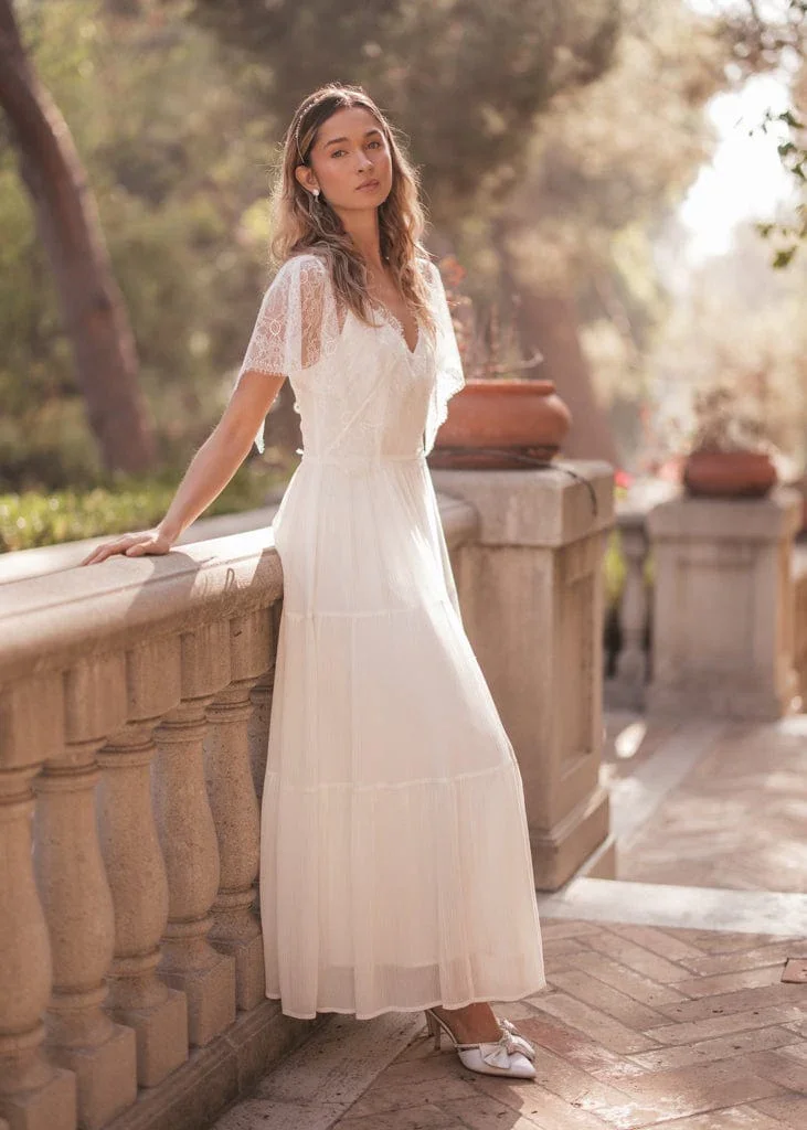The Zuri Dress is a graceful blend of simplicity and romance, featuring a tiered skirt and a delicate lace bodice with soft flutter sleeves. Its lightweight fabric and flattering V-neckline create a dreamy silhouette, perfect for weddings, garden gatherings, or summer soirées. With its timeless design, the Zuri Dress offers effortless elegance for any special moment.